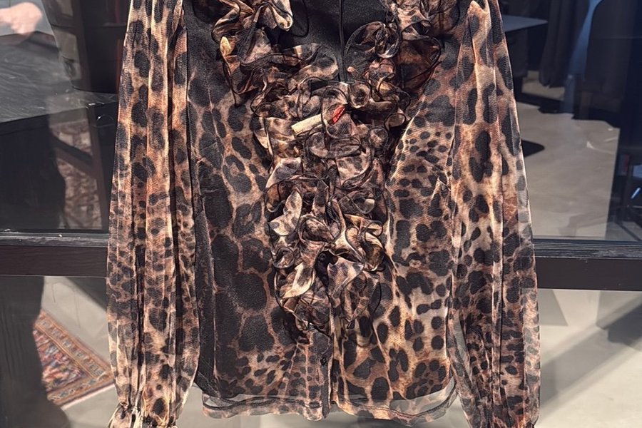 Blus med leopardmönster och volanger framtill. Långa ärmar med volangdetaljer vid ärmslut. Blusen har en hög krage och en dragkedja framtill.