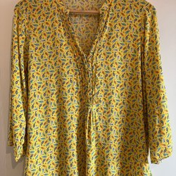 Blus med långa ärmar och ett blommigt mönster i gult, svart och vitt. Blusen har en rund halsringning med en liten öppning baktill som stängs med en knapp.