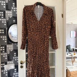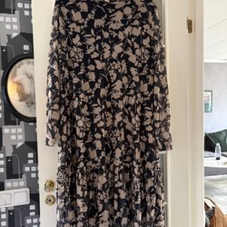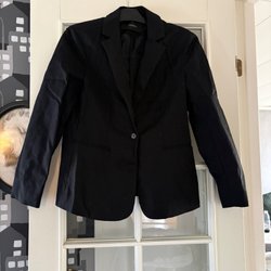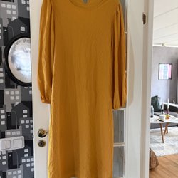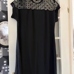 Svart lite glansig klänning. Jag har haft den som en lättare jacka utanpå kjol och blus. Riktigt snygg. Storlek 44 Lindex