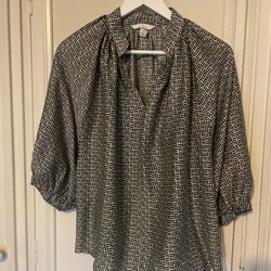 Ärmlös blus med ett svartvitt mönster. storlek L. 100% polyester, frakt enl. postens taxa