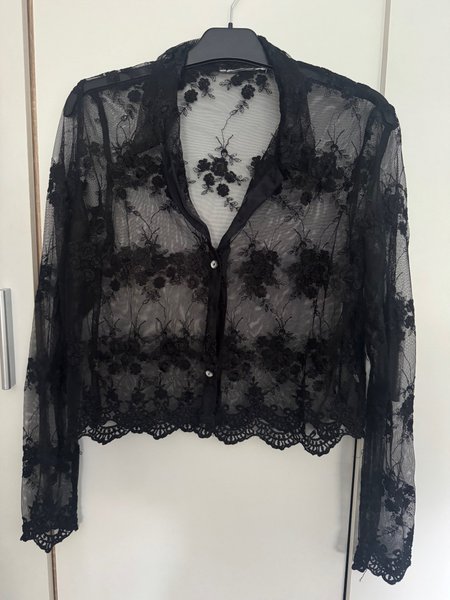 Svart spetsblus med långa ärmar och krage. Blusen har knappar framtill och ett blommigt mönster i spetsen. Nederkanten och ärmsluten har en vågig spetsdetalj.