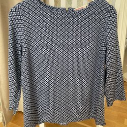 Mörkblå blus med ett diskret prickigt mönster. Blusen har långa ärmar och en v-ringning.