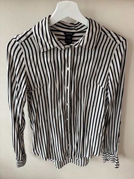 Blus med långa ärmar och knäppning framtill. Blusen har en klassisk krage och manschetter vid ärmsluten. Mönstret består av vertikala ränder i svart och vitt.Passar även storlek small