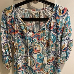 Färgstark blus med ett livfullt mönster som inkluderar paisley, blommiga och abstrakta motiv i nyanser av blått, rött, gult och vitt. Blusen har en avslappnad passform med en rynkad halsringning och trekvartsärmar.