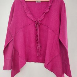 Vit blus med långa ärmar. Blusen har volanger längs knappslån och runt kragen. Ärmsluten är också försedda med volanger.