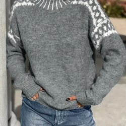 Stickad tröja med hög krage och långa ärmar. Tröjan har ett färgglatt mönster med ett hjärta på framsidan och blommiga detaljer.