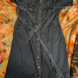 Brun, ribbstickad klänning från H&M med v-ringning, knappar framtill och ett avtagbart knytband i midjan. Klänningen har långa ärmar.