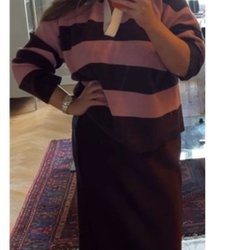 Brun och rosa stickad tröja med polokrage och ett mönster med renar. Tröjan har långa ärmar och muddar i nederkant och ärmslut. Ett unikt och iögonfallande plagg.