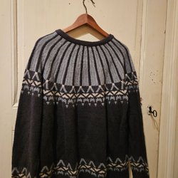 Färgglad stickad tröja med olika mönster på fram- och baksida samt ärmar.