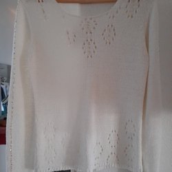 Vit stickad tröja med långa ärmar och rund halsringning. Tröjan har ett fint, luftigt stickmönster. Storlek S