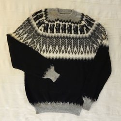 En svart och vit stickad tröja med ett unikt mönster. Tröjan har långa ärmar och en rund halsringning. Observera att det finns ett litet hål på framsidan, men helt ny. OBS! Alpaca. Storlek M.