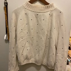 Beige stickad tröja med lång ärm och en stor krage.