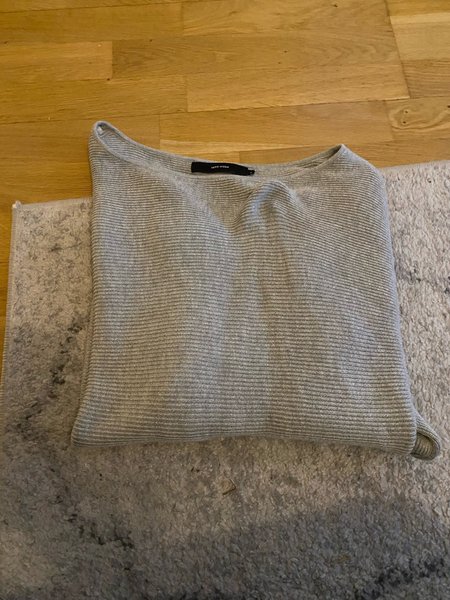 Grå, stickad tröja med lång ärm. Tröjan har en båtringning.
