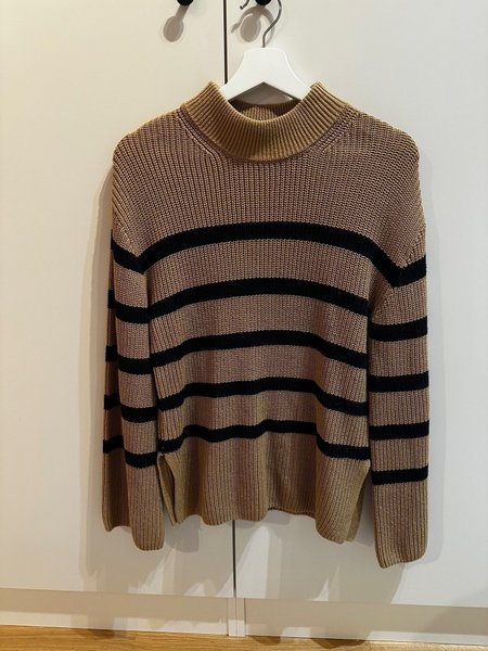 Brun stickad tröja med hög krage och svarta ränder. Tröjan har en avslappnad passform och sidoslitsar.
