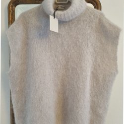 Stickad tröja med lång ärm. Tröjan har en fyrkantig halsringning och en avslappnad passform.Tröjan är av Ull ,den mäter fram 43 cm och bak 46 cm och under ärm till ärm 51 cm.Ärmens längd 45 cm.Kommer från ett rök och djurfritt hem .Frakten betalas av köparen .