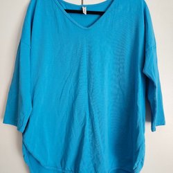 Blå stickad tröja med V-ringning och 3/4 ärmar. Tröjan har en avslappnad passform och en något längre baksida.