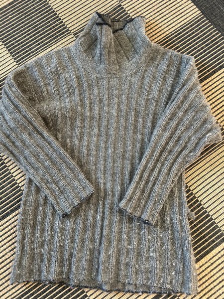 Grå stickad tröja med hög krage och långa ärmar. Tröjan har ett ribbat mönster. kanonfin passar medium/ large