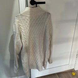 Snygg stickad tröja med hög hals och kabelmönster. Tröjan är i en beige färg och har en avslappnad passform.