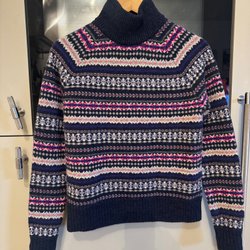 Här är en stickad tröja med ett unikt mönster. Tröjan har en fin V-Hals och långa ärmar. Mönstret består av olika färger och former, vilket ger tröjan en distinkt look.