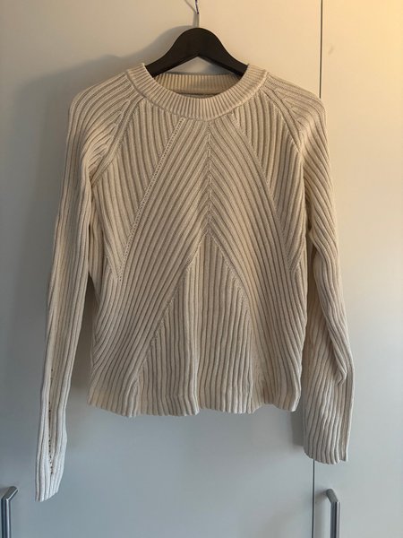 Beige stickad tröja med lång ärm och rund halsringning. Tröjan har ett ribbat mönster.