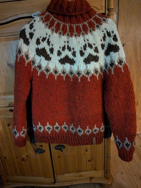 Stickad tröja med polokrage i ett mönster med inspiration från naturen. Tröjan har ett dekorativt mönster runt halsen och nedre delen av tröjan, samt ett björntass mönster över bröstet.