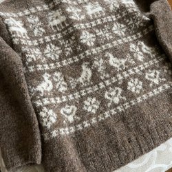 Brun tröja med ett traditionellt isländskt mönster runt halsen och nederkanten. Mönstret består av vita och grå nyanser.