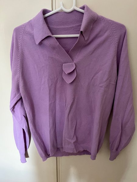 Ljuslila tröja med krage och en dekorativ detalj vid halsen. Långärmad med ribbstickade muddar och nederkant.