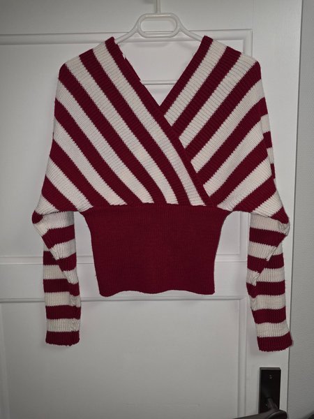 Röd och vit randig tröja med v-ringning och långa ärmar. Tröjan har en figurnära passform.