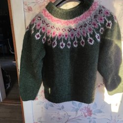 Ny stickad islandströja , stickad i isländskt ullgarn, Lèttlopi, med ett flerfärgat okmönster runt halsen. Tröjan har långa ärmar och muddar i nederkant och ärmslut.