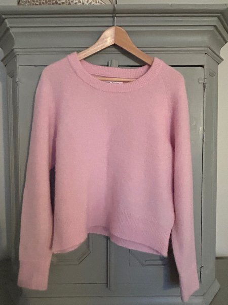 Rosa tröja med rund halsringning och långa ärmar. 32% alpacka, 32% ull, 30% polyamid, 6% elastan.