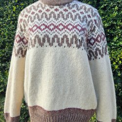 Tröja med rund halsringning och långa ärmar. Tröjan har ett mönster i brunt, vitt och grått runt oket och ärmsluten.