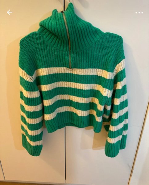Grön och vit randig tröja med hög krage och dragkedja.