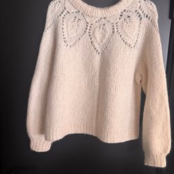 Ulltröja med rund halsringning och långa ärmar. Tröjan har ett mönster med horisontella ränder i blått, vitt och rött.