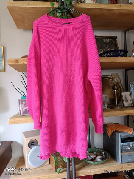 Långärmad stickad tröja i en livlig rosa färg. Tröjan har en rund halsringning och en avslappnad passform. Ärmarna avslutas med muddar och nederkanten är rakt skuren.