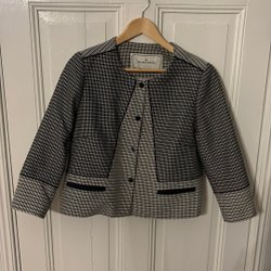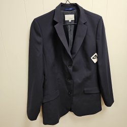 Lila kavaj med svarta detaljer. Kavajen har en broderad vapensköld på bröstet och kronor på ärmarna. Den har tre knappar fram och två fickor.