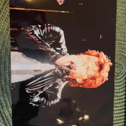 En grön sammetskavaj med svart krage. Kavajen har en knapp framtill och två fickor. Riktig festkavaj som är lite flammig i tyget, blir mer levande så. Fint slag och rak modell. Jag köpte denna, men tyvärr lite liten för mig. En riktig dyrgrip. Mått längd: bak ca 76 cm, ärm från axel ca 63, size 4 står det. Endast provad- superfin kvalitets design. Ej retur- se bilder väl.