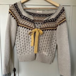 Set från Monki bestående av en kavaj och en väst i beige med smala, mörkare ränder. Kavajen har en dubbelknäppning framtill och fickor. Västen har en V-ringning och knäpps med tre knappar. Kavaj märkt med storlek S och väst med storlek 36