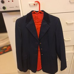 Mörkblå kavaj med en knapp och fickor fram. Fodrad med ett randigt tyg.
