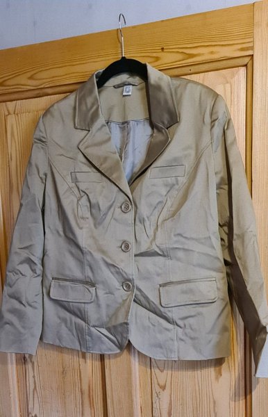 Beige kavaj med tre knappar och fickor fram. Matrl bomull med polyester foder. Rak modellen. Strl 42/44.