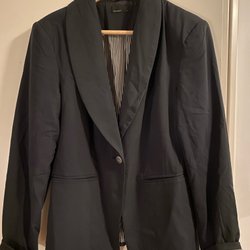 Svart kavaj med långa ärmar och en dekorativ knapp. Kavajen har detaljer som ger en unik och elegant look.