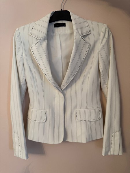Vit, figursydd kavaj med kritstrecksränder. Kavajen har två knappar, två fickor och en snygg krage.