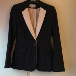 Svart kavaj med en knapp framtill och 2 fickor. Mycket litet använd. Strl 34. Helfodrad. Märke Divided. Längd 42 cm, bystvidd 75 cm. Snygg, figurskuren modell.