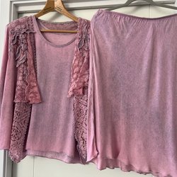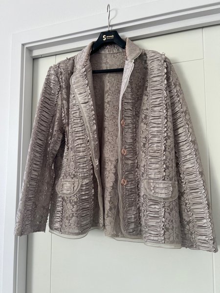 Elegant kavaj med en unik textur och detaljer. Kavajen har en vacker spetsdesign över hela plagget, kompletterad med veckade satinband som löper vertikalt längs framsidan, ärmarna och fickorna. Den har en öppen design med tre knappar framtill och en klassisk krage. Fickorna är dekorativa med en rundad form och veckade detaljer. En sofistikerad jacka som passar för många tillfällen.