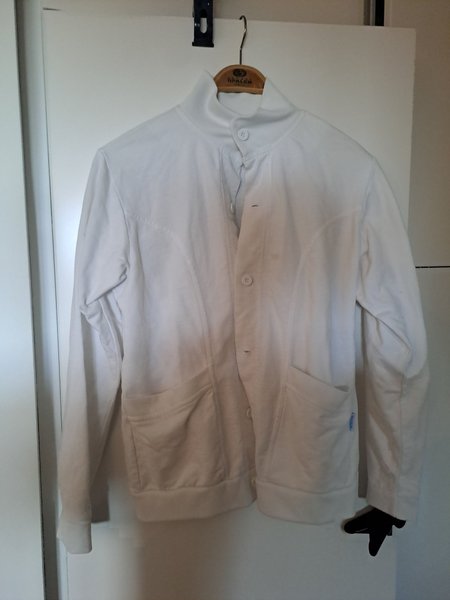 Vit jacka med knäppning framtill och hög krage. Jackan har två fickor framtill och muddar i ärmslut och nederkant.