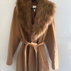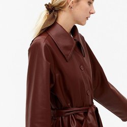 Elegant brun kappa med en stor knapp framtill och en hög krage. Perfekt för kyligare dagar och kvällar.