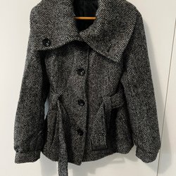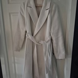 Sparsamt använd ofodrad kappa i 50 % ull och 50 % polyester . Ej öppnade fickor på kappan.