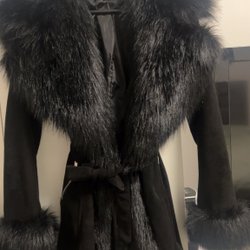 Svart dubbelknäppt kappa med bred krage och två fickor fram. Kappan har en klassisk och tidlös design.