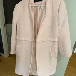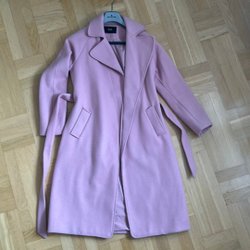 Elegant kappa( object) i en vacker rosa nyans. Kappans design inkluderar en bred krage och ett avtagbart band i midjan för att framhäva silhuetten.