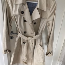 Beige trenchcoat med dubbelknäppning och knytskärp. Klassisk modell med krage och slag. Det finns fickor fram och justerbara remmar vid ärmslut. Foder i mörkare färg. Observera att det finns några små fläckar på sidan och ett litet hål baktill. strl S, men rymlig.