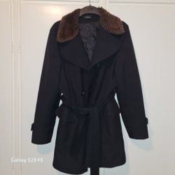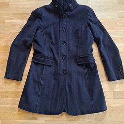 Elegant marin blå kappa i riktigt päls. Kappan har en unik design med horisontella ränder och dekorativa knappar framtill. Den har även fickor på sidorna och ett glansigt svart foder.